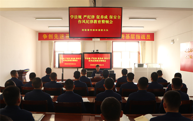 本网讯:(安宝)规章制度从严从实,日常管理抓细抓牢。为进一步严明纪律,规范人员日常养成,全面提升队伍正规化建设水平。近日,阿勒泰地区森林消防支队阿勒泰大队深入开展“学法规、严纪律、促养成、保安全”作风纪律教育整顿活动,科学安排部署,细化各项工作任务,明确工作目标,严抓队伍管理,狠抓作风养成,着力提高队伍纪律作风建设。