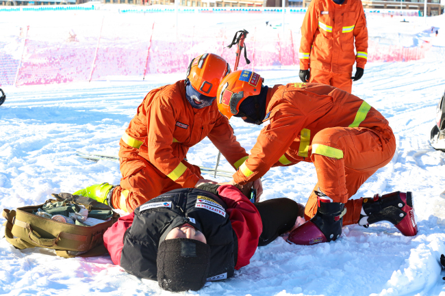 “嘀嘀嘀……”救援人员手中的雪崩搜救仪发出急促的响声,大家的脸上也露出激动的表情。“距离信号源0.5米,就是这里了,大家快挖。”救援小队扎进齐腰深的积雪中一边奋力清理积雪,一边大声呼喊着被困者的名字,“找到了!找到了!”不知是谁喊道。终于,在救援人员的协同配合下,被困积雪中长达30分钟的男子被成功救出。在对该男子进行简单检查后,救援人员第一时间利用应急保温毯对伤员进行包裹,防止体温流失,而后使用担架通过滑雪的方式将该男子转移至安全医疗救护地点。
