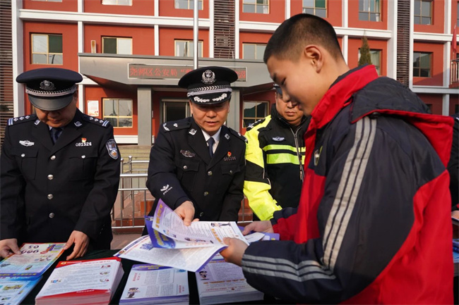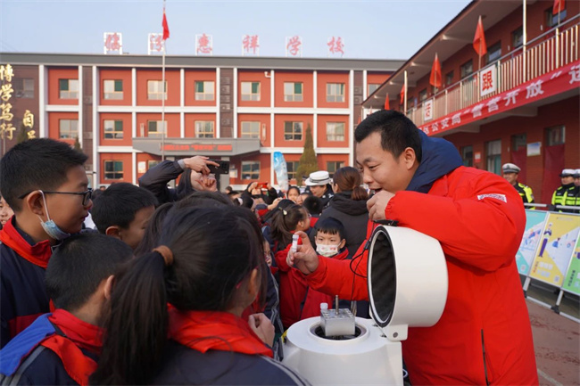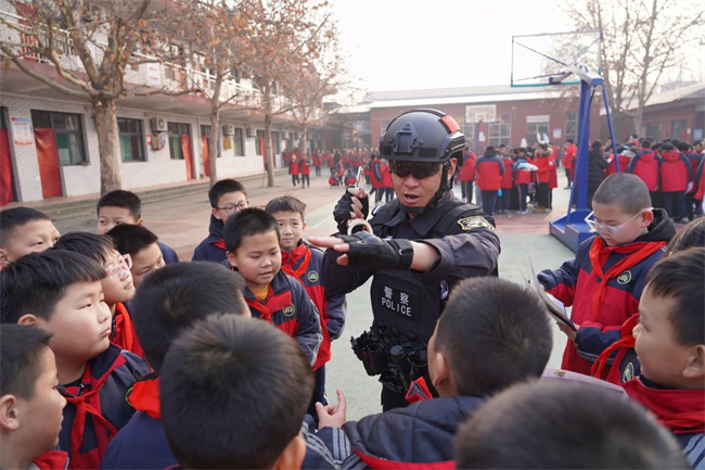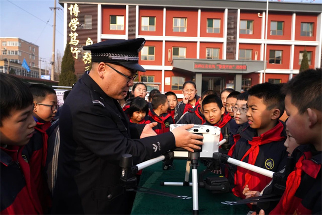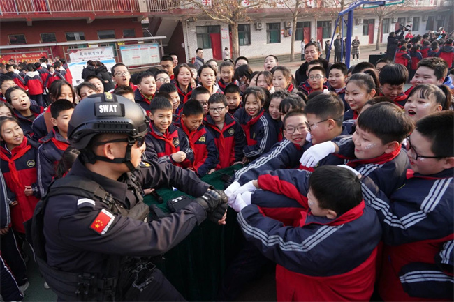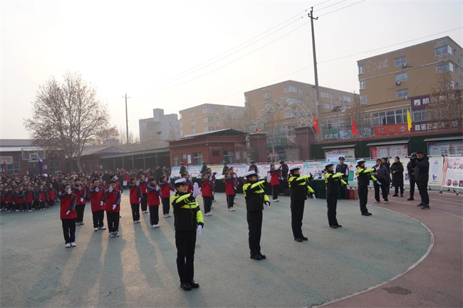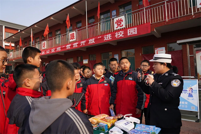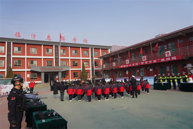 本网讯:(田哲斌)为大力弘扬警察精神、凝聚警心力量、提振警心士气, 使辖区校园师生更深入的了解公安、支持公安工作,“零距离”感受别样“警”彩,12月28日,在第四个中国人民警察节即将到来之际,尧都区公安局组织民警走进临汾惠祥学校,开展“警营开放”进校园活动。副区长、区公安局党委书记、局长崔军率队参加活动。