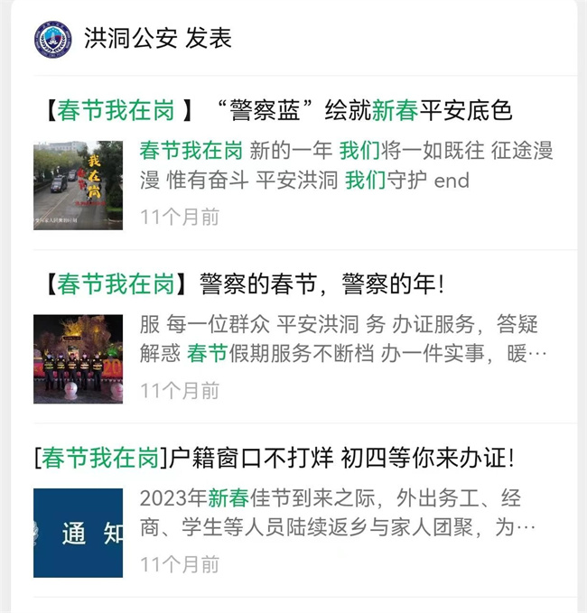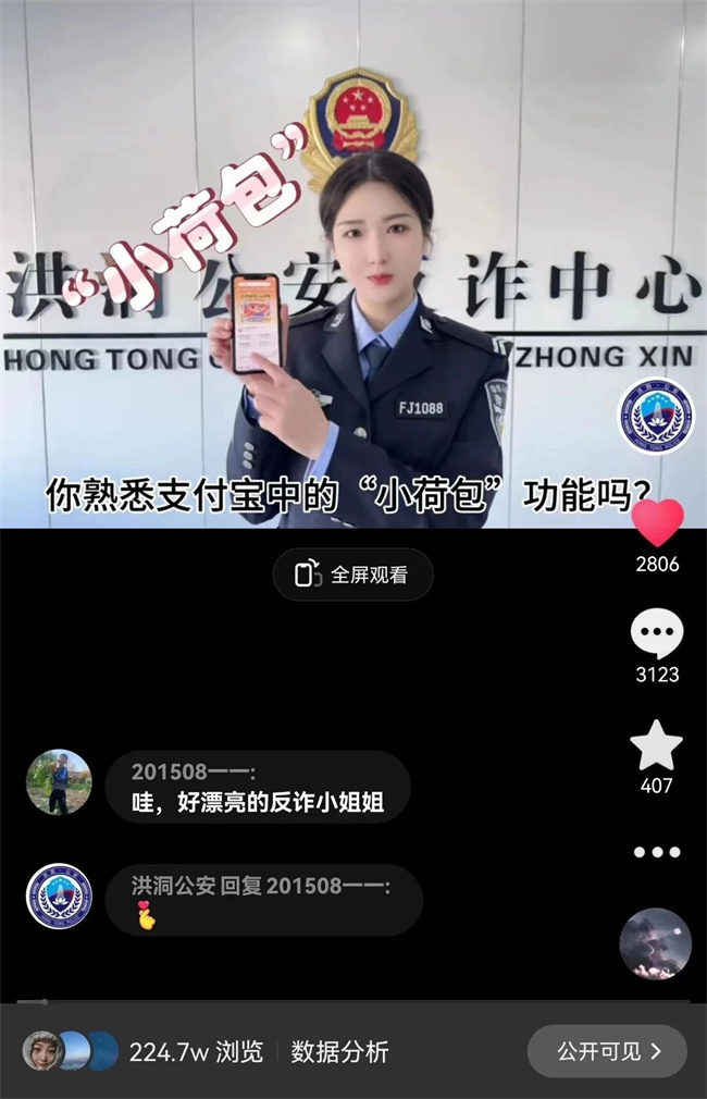 2023年,洪洞公安不断加强新媒体建设,“洪洞公安”微信公众号共编发信息464余篇,拍摄《反电诈系列视频》《全警实战大练兵》等视频,发送抖音短视频20余条,其中原创视频《骗局》在山西长安网群工作中表现突出,被评为优秀创作者;《请谨慎使用支付宝“小荷包”功能》反诈视频浏览量破百万,收到了很好的宣传效果。