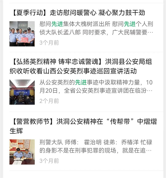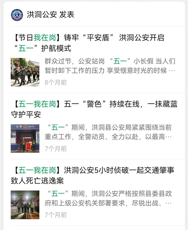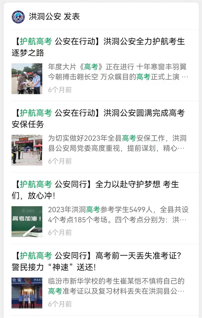 截至目前,先后在市级以上主流媒体和各类网络、新媒体发表新闻稿件 230余篇,其中在《人民公安报》《人民日报》《中国新闻网》等中央级主流媒体发表新闻稿件60余篇;《山西日报》《山西新闻网》《山西长安网》《山西法治报》《山西新闻网》《山西晚报》等省级主流媒体发表新闻稿件99篇;警苑心语、警方周刊、山西省公安厅等公安级主流媒体发表新闻稿件28篇,洪洞公安的影响力实现了新提升。