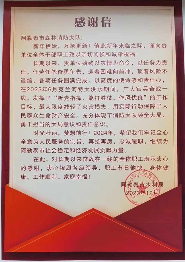 阿勒泰市水利局对长期以来,阿勒泰市森林消防大队始终以灾情为命令,以任务为责任,任劳任怨奋勇争先,迎着困难向前冲,顶着风险不退缩,确保各项任务圆满完成的战斗作风表示了充分的肯定。