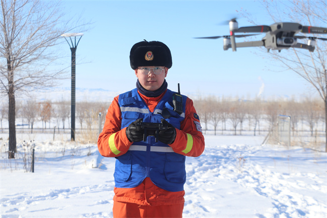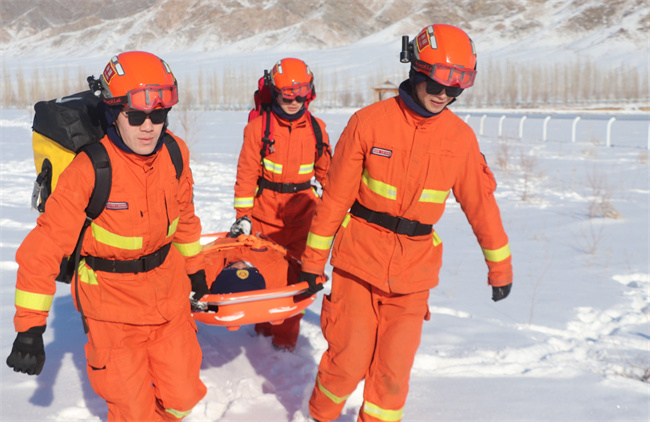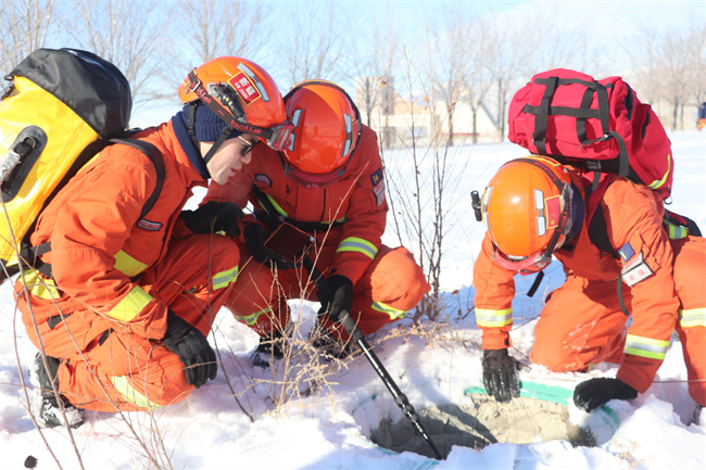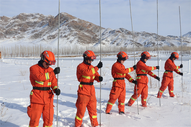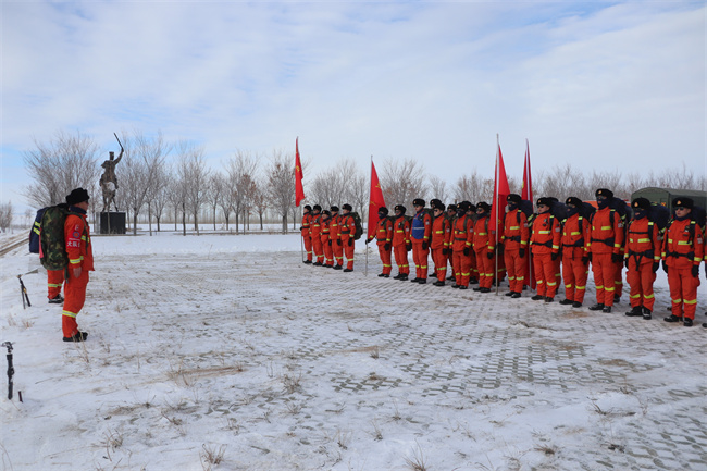 零下20度的富蕴县,白雪皑皑,呵气成霜、消防员在行军路上,行人、车辆甚少,显得格外宁静。突然,一声急促的哨音划破天空,“嘟……!停止行军!”“同志们!接上级指示,由于突发强降雪,富蕴县赛马场有多名牧民失联,命令我大队立即前往救援!”行军过程中,指挥员突然接到救援命令,此时距离行军目标点还有三公里左右,指挥员命令全体队员立即进行战备等级转换,采用前突小组抵近勘察,救援队伍急行跟进的方式,全力奔赴救援地点。到达救援地点后,前突小组利用无人机、北斗导航仪,对照现有地形图进行失联人员搜索和地形勘察,并详细制定救援方案。“报告,以我为中心向北400米处发现疑似失联人员遗落物资”“立即实施救援!”接到命令后,救援小组携带搜救装备前往搜救地点,医疗小组携带简易担架、低温冻伤急救药品紧随其后。人员脱困后,医疗小组利用简易担架将人员转移至安全地点,随后对被困人员的冻伤部位进行简单救治并等待下一步救援。
