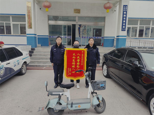 1月2日,失主遆某某来到铁路东派出所领到自己丢失的电动车,给公安民警送上锦旗表达谢意。12月中旬,铁路东派出所接到遆某某电动车丢失的报案后,迅速展开调查,查阅大量监控视频,循线排查,后抓获违法行为人于某,在其家中查获被盗电动车,随后返还失主。