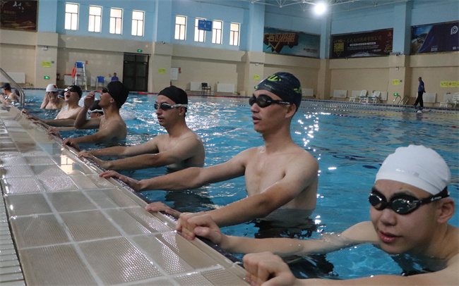 “班长,蛙泳过程中怎么才能有效且快速换气?”“为什么我游泳的时候总是不自觉下沉?”“身体放松,吸一口气后闭气,身体进入水中后,按照动作要领蹬腿抱水,一步一个动作,切莫心急,同时在水里时呼气节奏慢一些,保证胸腔里留有部分空气,头露出水面后,快速换气,慢慢体会找到适合自己的节奏……”训练中,教练员围绕理论讲解、下水实训、换气练习、连贯动作练习等多方面进行指导。