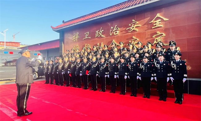 上午9时,全体民警身着警礼服,警容严整、精神昂扬,在机关大楼前整齐列队。现场指挥员一声令下,全体民警齐声高唱《中国人民警察警歌》,向警旗敬礼,红蓝相间、警徽熠熠的警旗在嘹亮的歌声中冉冉升起,高扬在警营上空。
