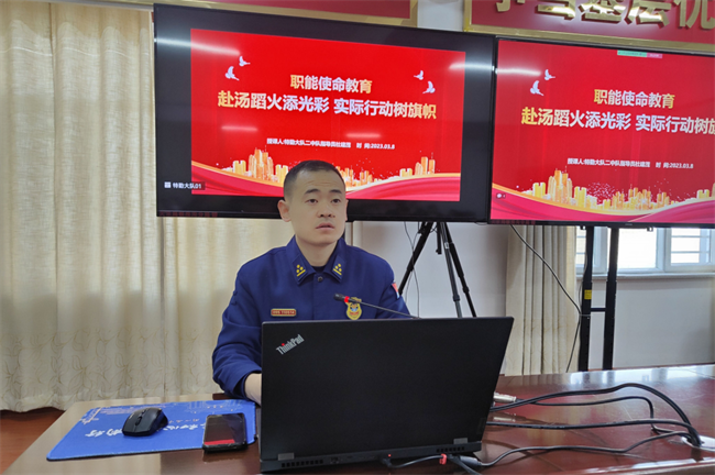 大队坚持以习近平新时代中国特色社会主义思想为指导,以学习贯彻党的二十大精神为主线,认真开展“学思想、强党性、重实践、建新功”主题教育,持续抓好“牢记领袖训词,永做忠诚卫士”主题教育,引导指战员把个人理想追求融入党和国家的事业之中,把政治热情转化为干事创业的强大动力,让党旗在任务一线高高飘扬,努力在“以学铸魂、以学增智、以学正风、以学促干”方面取得实实在在成效,增强“四个意识”、坚定“四个自信”、 坚决做到“两个维护”。