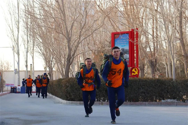 “预备!开始!”随着考官的一声令下,参赛指战员如同离弦的弓箭一跃而出,脚下生风,勇往直前,一场负重五公里越野的“大战”,点燃了这个寒冬考核的第一把火。你追我赶、相互鼓劲,尽管身上背负20斤的背囊,他们的脚步却从不停歇,任凭汗水浸湿衣衫,他们的身上展现着一名战斗员的身体素质和意志品质。