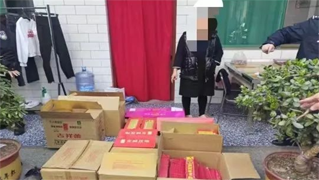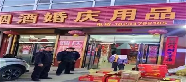 2023年11月23日,治安大队在工作中发现,违法行为人王某兰(女,现年50岁,大张镇人)在其经营的婚庆用品店内非法储存、买卖烟花爆竹,民警当场查扣各类烟花爆竹15箱。