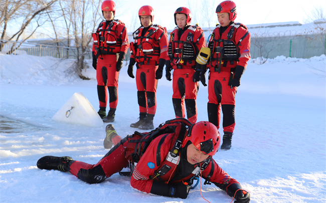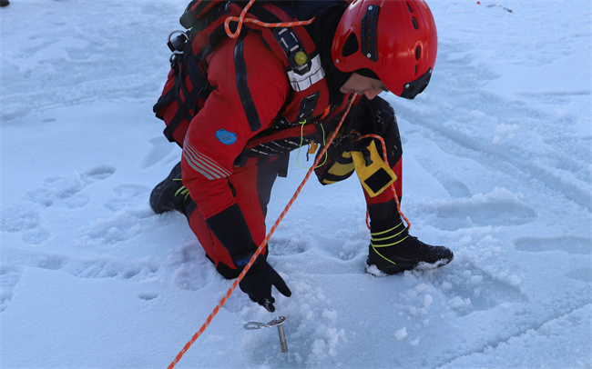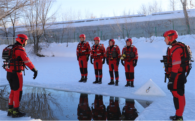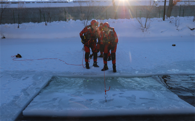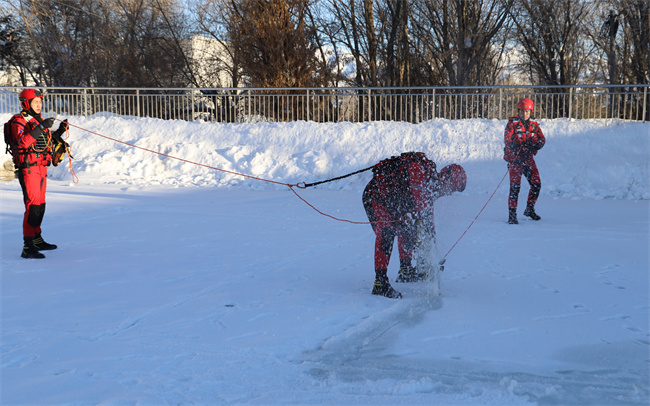 培训队针对冰面救援突发性强、时间紧迫、技术要求高、危险性高的特点,对器材运送、锚点制作、冰面爬行、人员配合、冰面营救、急救自救、安全防护、安全撤离等科目开展实战化训练。训练过程中,全体参训人员相互协作,密切配合,严守操作规程,参训队员克服寒冷天气带来的不利影响,展现出了不畏严寒、迎难而上、勤学好问的进取精神,不但熟悉了各类冰面救援装备,而且掌握了冰面救援技能,切实提高了队伍冰面救援和应急处置综合能力。
