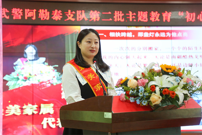 “无论是‘火焰蓝’还是‘橄榄绿’,陪伴都是最长情的告白,幸福就是你给我一个温暖的肩膀,我还你一份生死相依的勇气。”报告会上,阿勒泰地区森林消防支队副政治委员宋文涛的妻子王青果用朴实无华的语言向大家诠释了奉献与付出。王青果认为健康的婚姻关系就像两朵彼此独立又各自盛开的鲜花,在相互影响中携手余生。