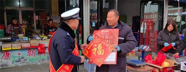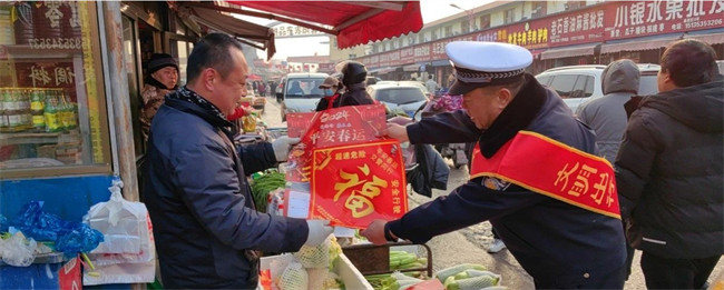 本网讯:(王新晋)“龙腾盛世迎新春,福照神州庆丰登”,随着春节的临近,农村集市热闹非凡,人们纷纷购置年货,尧都区公安局交警大队民警延续往年传统走进集市,开展“集市送祝福、送平安”活动。