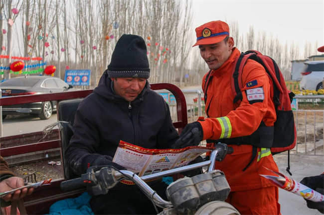 “新年快乐!阿姨,我们是阿克苏森林消防大队消防员,这是我们精心制作的防火宣传单,里面有一些森林防灭火小知识,以及小礼品,进入景区请勿携带火种......”在胡杨岛景区的入口处,宣传小组通过发放防火宣传单、悬挂防火标语、设置宣传展板等方式向游客和群众传递防火知识,宣讲防火工作应重点注意事项及森林火灾的危害,教育引导游客注意防范森林火灾。