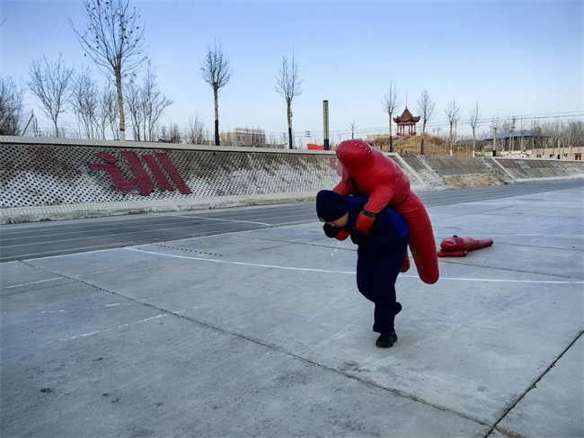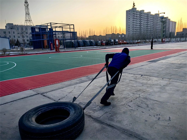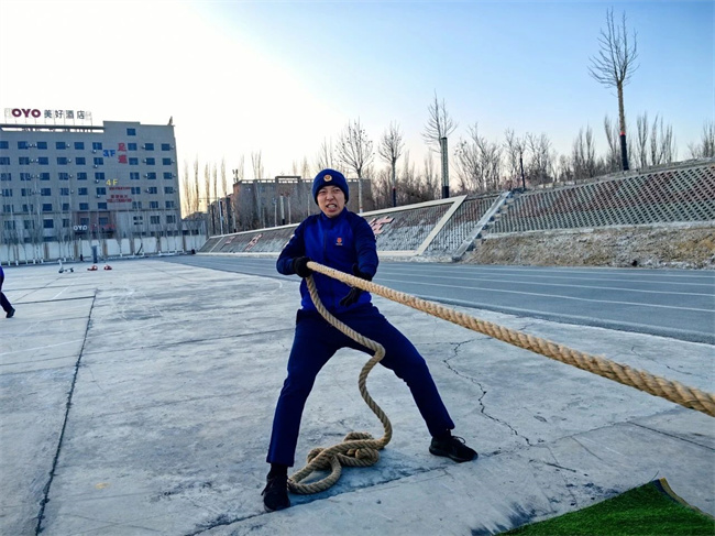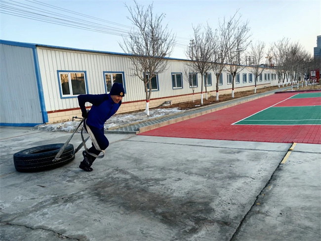 综合体能竞技训练难度系数较大,主要由轮胎拖行、沙袋搬移、雪橇车拖拉、倒木搬运、伤员背运、重物拉升等六个环节组成,内容对标队伍“全灾种、大应急”的任务实际,体现在遂行防火灭火、抢险救援等任务过程中,针对救援现场的重物搬运、转移伤员、破除障碍等情况进行训练,以此达到练为战的目的,对指战员的力量、耐力、爆发力以及协调性都有较高要求。