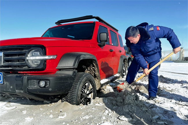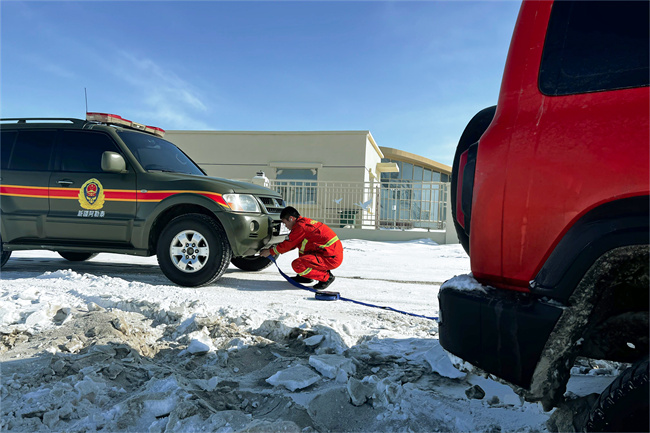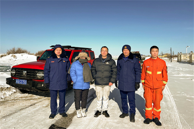游客表示:他们是异地租车自驾旅游,从车辆被困后已经40分钟,手机信号断断续续,无法与外界保持正常联系,加上室外温度已达-36℃,又无来往车辆,他们非常害怕。消防救援人员不断安抚他们情绪,并通过现场侦查,车辆陷于粉末状冰雪中,陷入时间较长,雪面已经结冰硬化,越野车四轮无法借力。消防救援人员在确保无次生灾害发生的情况下根据实际情况制定救援方案,组织救援人员使用铁锹对车辆周围的积雪、冰块进行铲除,派出1名驾驶员对车辆进行操作配合消防救援车辆的牵引绳将被困车辆移出雪地。