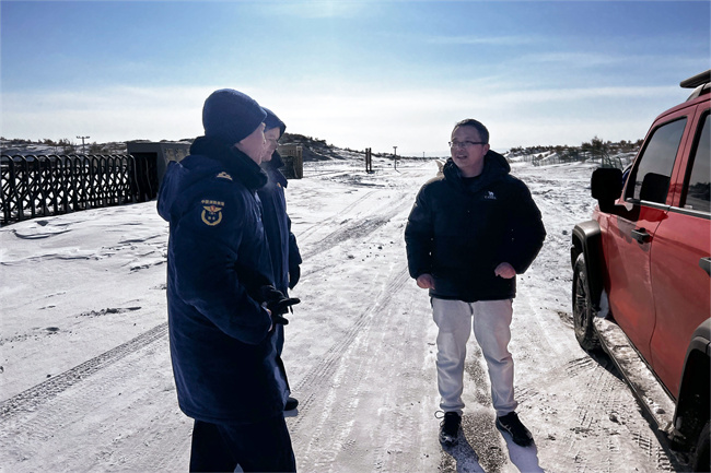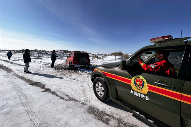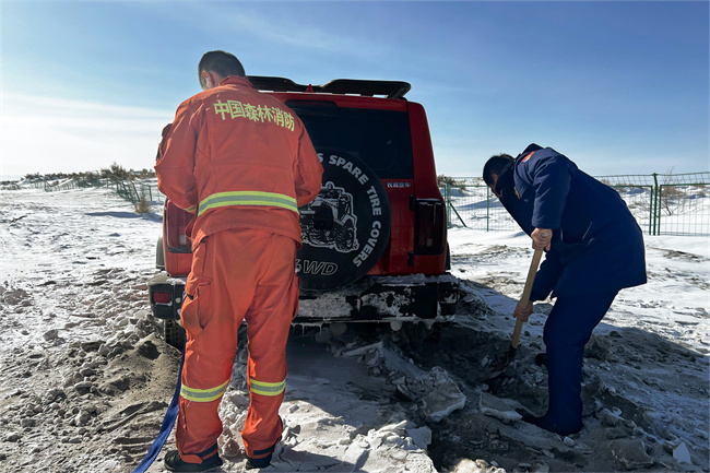 2月18日晚15时30分许,阿勒泰地区森林消防支队外出踏查返回途中,在福海县黄金海岸周边乡道上,遇到一辆越野车陷入路边雪堆,无法脱困。