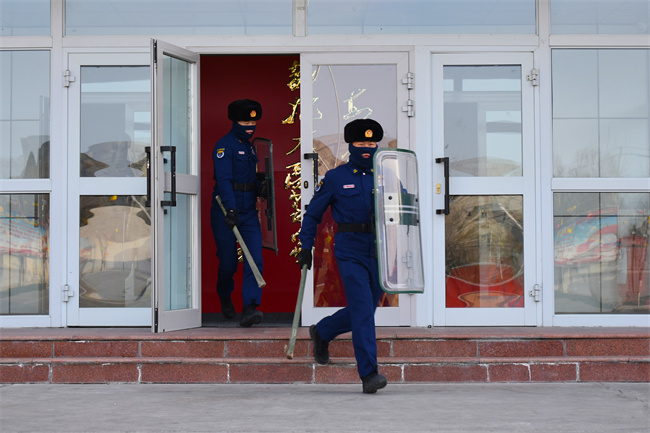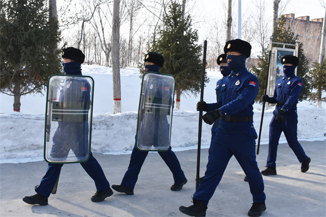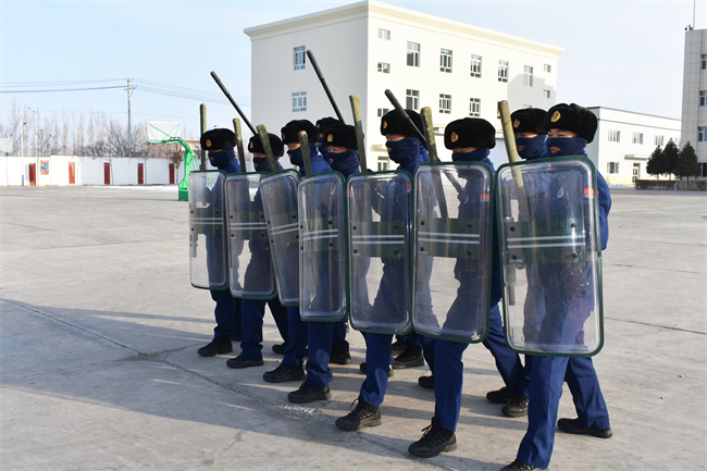 演练以营区突然受“不法分子”袭击为背景。哨兵第一时间拉响警报并向大队值班室汇报,分队迅速启动处突预案,组织人员携带防爆盾牌和警棍等执勤装备,第一时间在事发地点形成防御阵型,并运用盾牌墙防御队形防御保护、喊话攻心、穿插分散等战术手段将“不法分子”制服。
