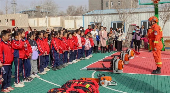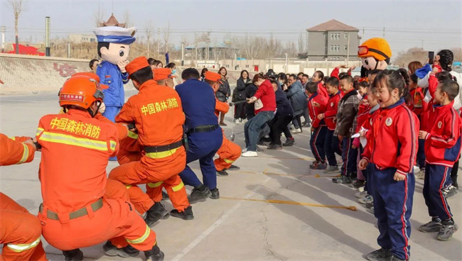“同学们,在大家眼前有着长长的风筒的就是我们灭火救援装备风力灭火机……”学生们围成一团,眼睛一眨一眨的看着消防员叔叔手中的装备。消防员向学生们展示完灭火救援装备以后,讲解员还认真讲解了灭火救援、地震救援、水域救援等常用森林消防综合救援装备器材以及车辆的性能与作用,并让他们“零距离”体验。消防员对师生和家长讲解了灭火器的操作与使用,并组织了一场拔河比赛,让他们在轻松愉快的氛围里学到更多有用的森林消防安全知识。