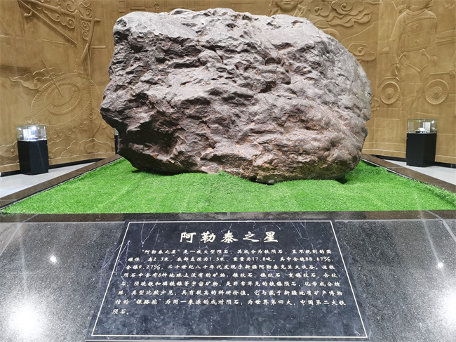 进入天文馆后映入眼帘的是一块天外来“庞然大物”,在讲解员认真细致的讲解下,队员们了解到这个“庞然大物”就是阿勒泰天文馆的镇馆之宝——“阿勒泰之星”,这是一颗世界第四大、中国第二大陨石,重量为17.8吨,其中含铁88.67%,含镍9.27%,该铁陨石中含有6种地球上没有的矿物:锥纹石,镍纹石,变镍纹石,合纹石,陨硫铁和磷铁镍等宇宙矿物,是非常罕见的铁镍石化学成分特殊,类型比较少见,具有较高的科研价值。