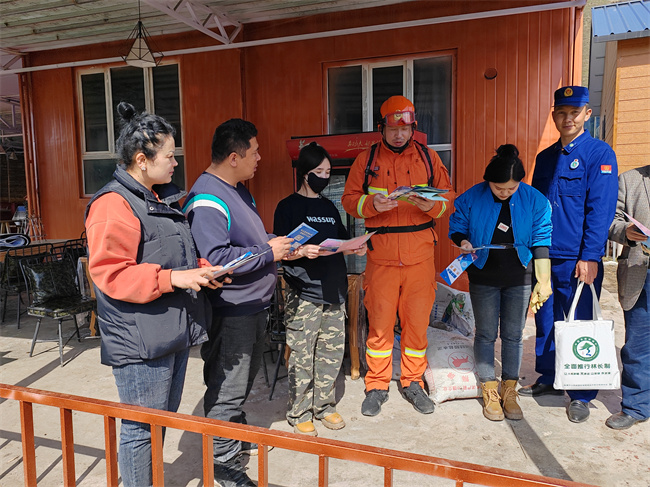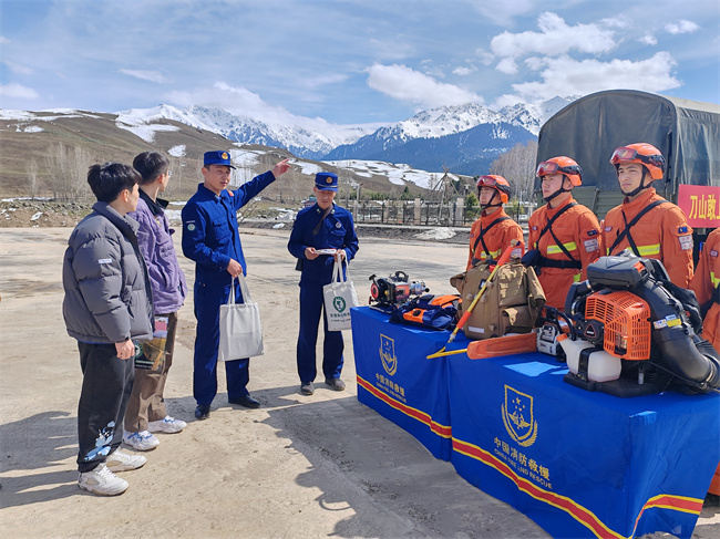 “游客,你好,进入景区林区严禁野外用火,防止发生森林火灾,如果发现森林火灾,一定要迅速撤离到安全区域,并及时拨打森林火警电话12119……”。此次防火宣传,驻防分队主要通过发放宣传礼品和宣传资料、现场讲解森林草原防火常识等多种形式向驻地群众宣传森林防火须知、森林火灾危害、扑救森林火灾及火场逃生方法要领等知识,让驻地群众知法、懂法、守法,切实提高群众自我防范意识和风险规避能力。在防火宣传过程中,讲解员详细介绍灭火装备构造和主要性能,邀请围观群众进行亲身体验,让群众感受灭火装备的实际效能,进一步增强重点人群的森林防火意识,最大限度降低火灾风险隐患。