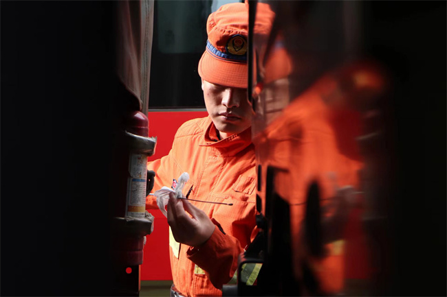 在遂行任务过程中,他们是运输保障的中坚力量,担负兵力运输、装备运载、物资投送等重要任务。如果把交通运输比作救援任务的命脉,那么驾驶员就是命脉中流动的血液。长途机动中深山密谷、山高坡陡、道路阻断……,他们不但驾驶技术高超,还要维修技术精湛,故障排除、更换轮胎等对他们而言都是“小菜一碟”。驾驶员魏立昕说:“作为驾驶员,每次出车前,我总要在车周围转上四五圈,然后钻到车底去看看,确保把车的每个部位都检查到”,他们用强烈的责任感担负起队友们行程中的安全,用自己的辛勤付出,来守住行车安全的底线。