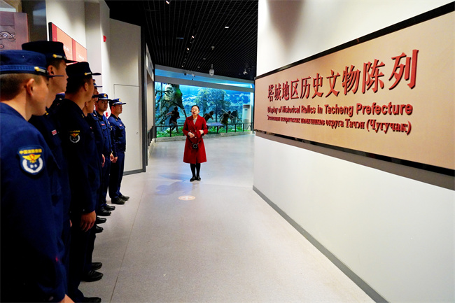 一件件文物和展品,静静诉说着塔城历史上各族人民守望相助、亲如一家的故事。塔城红楼博物馆从历史、民族、现代等各个方面一一展现了塔城的昨天和今天,用图片、文字、腊像、雕塑等方式,极为全面而真实的向消防救援人员们展示了他们的居住条件、生活方式、穿着服饰、美食文化,让消防救援人员们直观而形象的便能了解,如能细细地观看,塔城的历史脉络就会在脑海里越来越清晰。