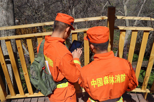 踏查工作是防范森林火灾、摸清地形、熟悉林相、提高救援成功率的有效途径,再完备的地图也不及双脚丈量的真实,只有深入到森林草原对各类数据进行取样、汇总、比对,切实掌握第一手资料,才能做到居安思危有备无患。大队高度重视春季森林防灭火工作,针对当前防火形势,本着“全覆盖、无盲区”的原则,深入野核桃沟风景区开展踏查工作。“你们看,从无人机拍摄的视角看,景区内植被茂密,林区可燃物载量较多,地表可燃物覆盖在林下与绿色植被交错叠加,主要以落叶、枯枝为主,可燃物较为干燥容易引发森林火灾……”踏查期间,踏查小组采取无人机高空观察与实地勘察相结合的方法,携带地图、望远镜、测风仪、等勘察装备,深入林区各个山头,实地查看、询问了解、研究分析的方式对森林覆盖率、可燃物载量、水源分布、地形地貌、山脉走向、植被类型、道路交通等情况进行勘察,而后与景区相关负责人提供的信息进行对比,形成精准的踏查分析报告,对高火险区域进行了标绘记录,重点标记出林地植被分布特征、林下可燃物等关键信息,直观感知林情地貌、现场分析火灾特点规律及预防重点、险点,研究防范对策措施、力量部署方式、具体战术战法,确保采集资料的准确性、系统性和全面性。