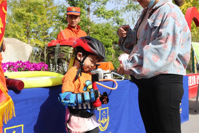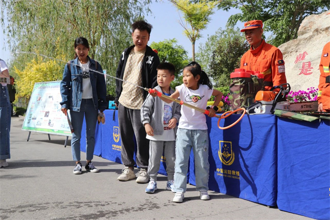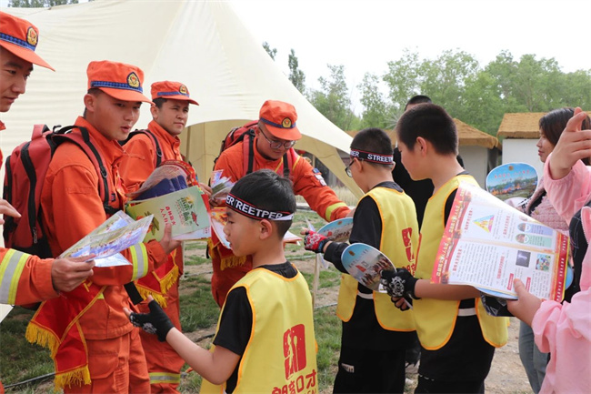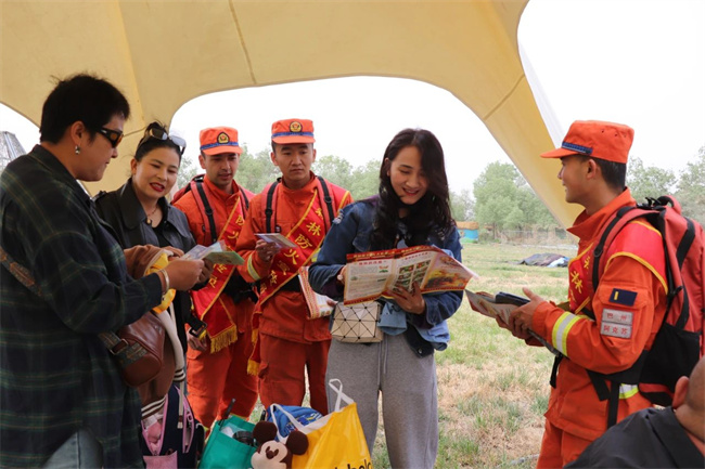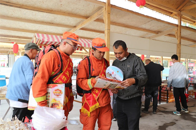 “叔叔您好,最近气温较高,进山入林期间请勿携带火种,这是我们的防火宣传单,请您看一看,里面印有在景区游玩时需要注意的一些森林防火常识。”四级消防士王玉涛不断向进入景区游玩的游客发放森林防火宣传单,提醒游客在景区注意森林防火。