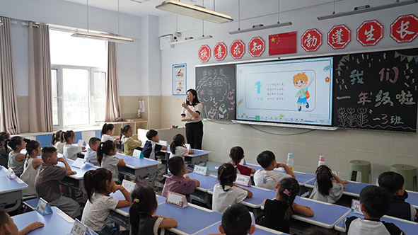 教室里,破冰游戏让孩子们快速融入集体,绘本故事《要开学了,好紧张》则缓解了孩子们的入学焦虑,老师也各自分享了童年的开学故事,引得孩子阵阵欢笑。此外,孩子们还通过动画短片和行为规范歌,在欢乐中学习校园规则。