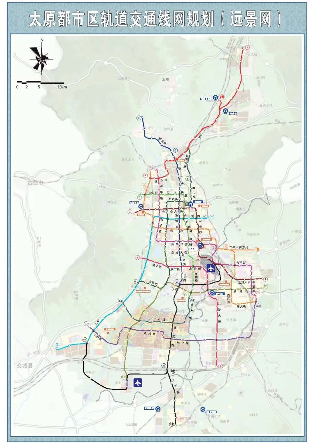 1号线、3号线、4号线兼顾太原中心城与晋中中心城的联系,2号线、5号线、6号线主要为太原中心城服务,7号线、8号线加强清徐、阳曲与太原中心城的联系,R1、R2线加强潇河产业园区与太原中心城的联系,R3线加强潇河产业园区东西轴线上和晋中中心城的联系。