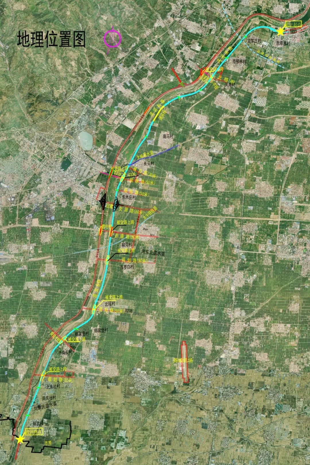 滨河东路南延建设工程北起西草寨村,南至太原市界,全长约30.3公里,道路设计红线宽度51.5/57米。道路线形结合都市区规划、综改区潇河产业园二期规划路网、汾河河堤位置及现状地形等综合确定。