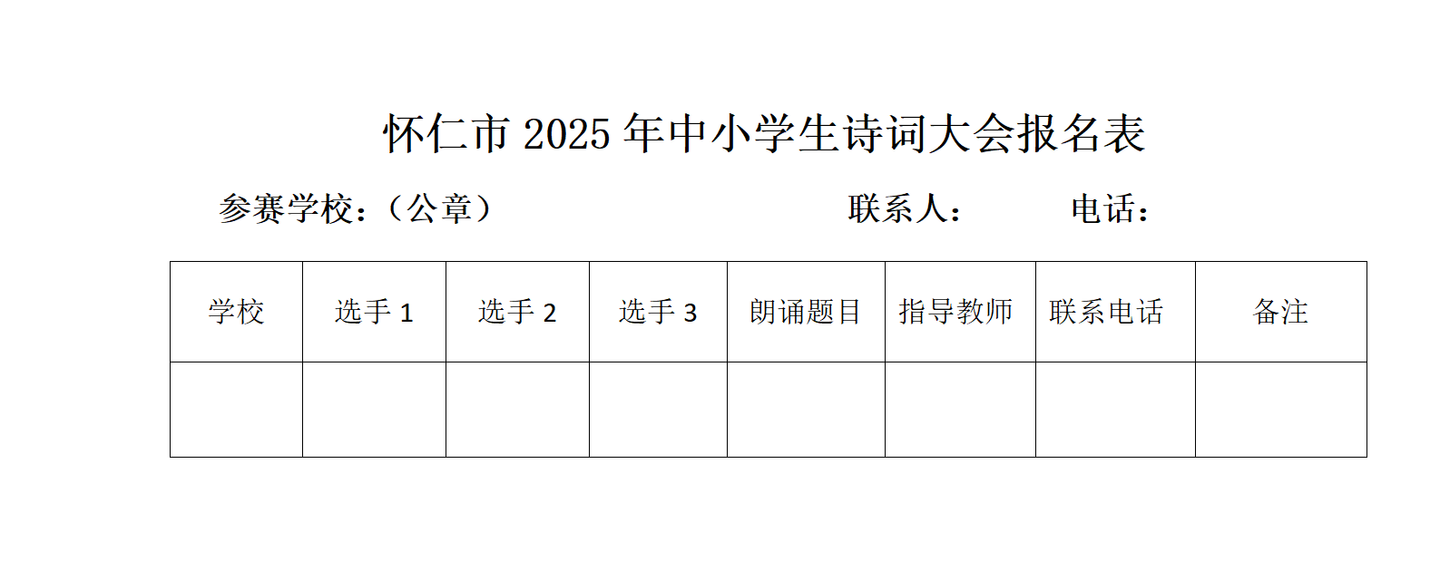 通过举办古诗词大会,引导学生领略诗词之美,从先贤的智慧和情怀中汲取营养涵养心灵,继承和弘扬中华民族传统文化,增强民族文化认同感,增强民族凝聚力和创造力,厚植爱国情怀,同时培养学生的语言表达能力和团队合作精神。1、第一环节(5分):穿越历史,演绎经典。各校选送的3个选手同台合作,共同完成一个自选节目。所选诗词数量根据长短自行定夺(长篇一首,或短篇多首必须是有机联结),时间控制在4分钟内。2、第二环节(2分):迷宫拾遗,书写诗句。每位选手从选中的九宫格中找出一句古诗正确诵读并书写,诵读得1分;书写按照笔画顺序、间架结构、规范美观得1分,时间控制在2分钟。3、第三环节(3分):诗韵飞扬,飞花对决。1、每校选一个选手集体上台,主持人说出要飞的字,选手只要背诵含有规定关键字的诗句即可,所答诗句不能与本轮已答的诗句重复。飞花开始,答不出者可以求助本队队员两次,20秒内未对上即失败。第四环节:抢占先机,依画吟诗。此环节为决赛抢答环节,所有选手集体上台,根据大屏幕展示画面,吟诵出与此画意境相符的完整(包括诗题、作者及朝代)古诗词一首,抢答正确加0.2分,抢答错误减0.1分,时间控制在3分钟内。1、各校需在大赛前自行组织开展预选活动,遴选出优秀选手报送活动中心参赛。2、朗诵必须使用普通话。发音标准,吐字清晰,声音洪亮。3、为保证公平、公正、参赛选手按编号顺序出场参赛,背景音视频不得透露姓名、校名。4、大赛分小、初、高三组,多场预赛,一场决赛。决赛名额按各校参赛选手预赛团体总分排名前六(初高中是前三)录取,参赛选手通过抽签决定出场顺序。大赛分三组:小学、初中、高中。先预赛,后决赛。小学组设团体一等奖1个,二等奖2个,三等奖3个;初高中组设团体一等奖1个,二等奖1个,三等奖1个;个人奖三个组别均设一等奖1个,二等奖2个,三等奖3个;优秀奖若干名;优秀组织奖若干名。以学校为单位报名,每校需选派3名选手参赛。将纸质和电子文档于3月18日前报怀仁市教育改革发展研究中心。过时不候。联系人:彭利娟15834258750 杨华18603497670(一)加强领导,精心组织。各校要高度重视,主要领导亲自把关,精心组织,把本次大赛作为加强学生思想道德建设、活跃校园文化建设的重要抓手。(二)把握导向,突出特色。各校要增强大局意识,加强发动宣传,强化赛事引领,紧扣文化自信,打造人人读经典的热潮,力争在全市大赛中赛出风格、赛出水平,为营造“书香怀仁”“文明城市”蓄力赋能,产生辐射叠加效应。(三)厉行节约,确保实效。要坚持勤俭节约原则,严禁形式主义、铺张浪费,确保务实、节俭、高效地组织好本次活动。(四)参赛学生要严格遵守比赛规则和纪律要求,尊重评委和其他参赛选手,展现良好的精神风貌和道德风尚。