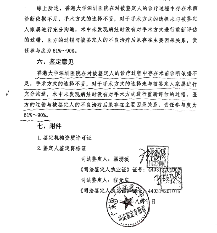 法院委托广东中一司法鉴定机构对此医疗纠纷进行鉴定,2019年8月10日出具的鉴定意见显示:医方仅凭外院PET-CT检查报告即对被鉴定人诊断为“胰腺癌”,术前MRI未见胰腺肿块、ERCP创检未见肿瘤细胞,无足够的影像、病理学依据;术中探查未见胰腺有明显的肿块、病灶时,未及时告知家属;被鉴定人高龄,有高血压病史,在无明显的恶性肿瘤组织学证据下行“全胰切除术”,手术创伤巨大且对被鉴定人的全身营养代谢及水电平衡产生严重影响,其死亡与手术方式的选择有一定关系,综上,港大深圳医院的过错与被鉴定人的不良治疗后果存在主要因果关系,责任参与度为61%—90%。