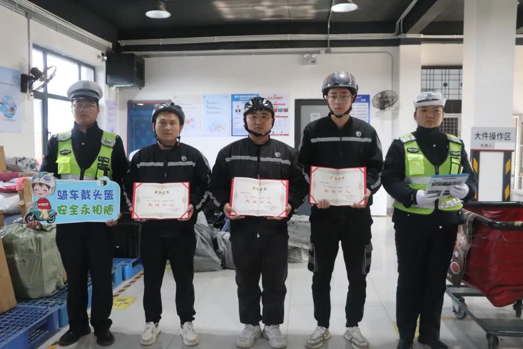同时,民警要求企业负责人严格落实安全主体责任,加强从业人员日常管理与安全教育,严格督促驾驶人在运输途中自觉抵制交通违法,杜绝违法行为,共同维护道路交通安全秩序。随后,民警向三名快递(零违法、零事故)的员工,颁发了“文明交通”荣誉证书,文明交通代表作了表态发言。
