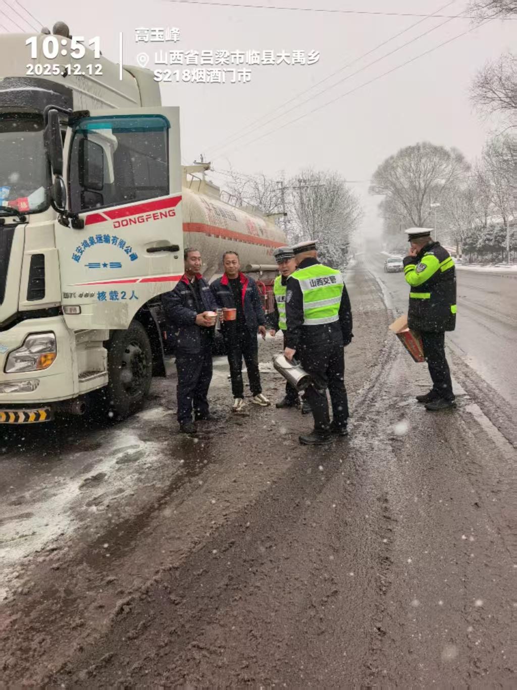 他们在临县城区主干道、国省道危险路段、学校周边等路段顶风冒雪指挥交通,疏导车辆,排除冰雪隐患,对打滑车辆及时上前帮扶,对路面滞留车辆,送水送方便面,暖心服务受困司机,同时联合公路部门开展除冰铲雪作业,并通过微信、抖音等平台实时发布路况信息,提醒驾驶员避开危险路段,雪花落满肩头,冰雪凝结眉梢,他们用坚守驱散严寒,用责任守护平安,成为风雪中最美风景线。